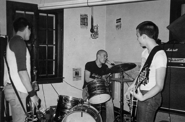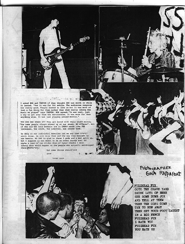 BUT lo and behold G.O.C came back alive in late October 1982. The band members differed at first but this G.O.C ended up being Trevor - vocals, Rob Dahl - guitar, Matt O'brien - bass, and Kier Murrey - drums. The new GOC were mostly a fun band. The started rocking "just to play around because we were bored". The got lots of shows (the one at Joe's with White Cross and other bands ruled, thats where the pictures were taken) and played lots of parties too. GOC also played at Community High on Halloween which was fun.