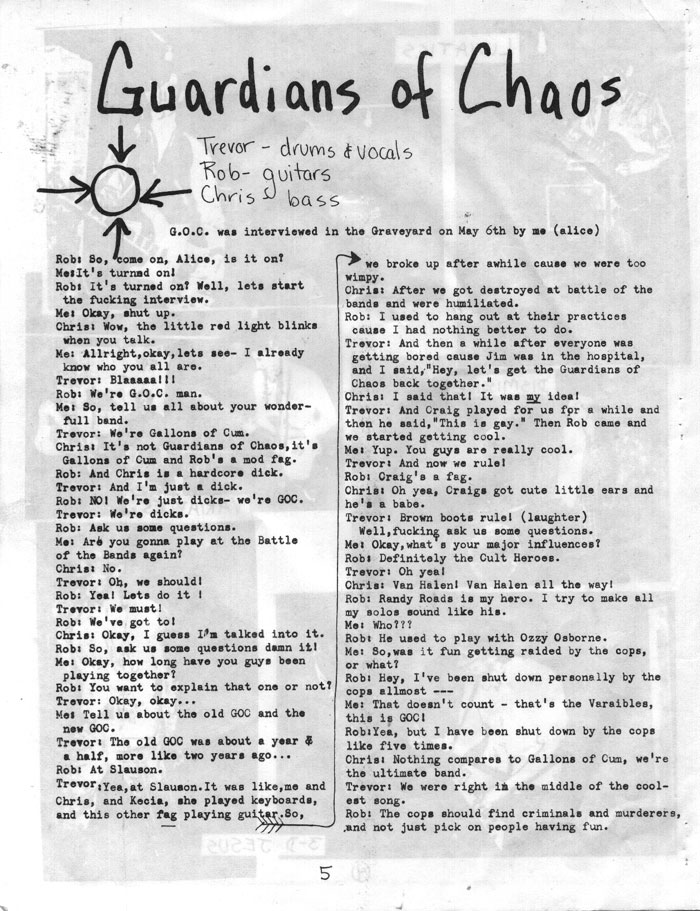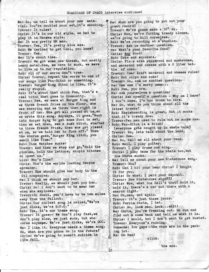 The original Guardians of Chaos got together about 2 and a half years ago in 1980. THEN the band members were: Chris Hansen - guitar, Chris Day - bass and Trevor Staples - drums and vocals. Everyone seem to think they were hot. They were of the final bands in the BATTLE OF THE BANDS but I guess the Saline bomb dudes didn't like them so they lost. After that show they lost interest in their band, the motivation was gone the original G.O.C. died.