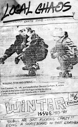 Hello, my name is Wes and my friends and I published a 'zine back in the 80's called "local CHAOS". We had a way cool music and skate scene then and that gave us lots to write about. We wrote about our "skate missions", published letters and "scene reports" that skaters sent in , did some music reviews, skater art, skate spots, contests and sessions. Stuff like that. Anyway... fast forward 20 years and we now have a website based on those same ideas. Pretty much anything is a go here. So check out the flyers, stickers, music, videos , random artifacts and over 600 images in the various gallery sections. Anyone that I skated with in the past... PLEASE drop me a line. Would be cool to hear from you.