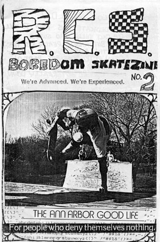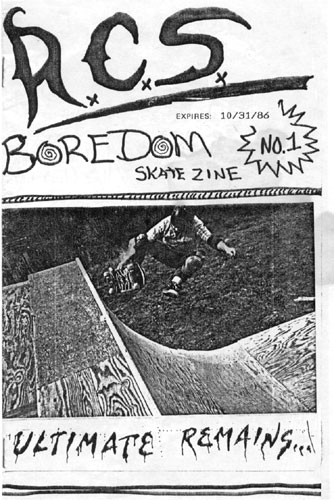 "RCS Boredom" was Jeff Hadley's 'zine and featured the skating that took place at his vert ramp. Published in 1986 and produced mostly at where he was working at that time, Jeff was able to put his 'zine together and get it out with little effort. Access to the department "copy machine" was a luxury item in those days.