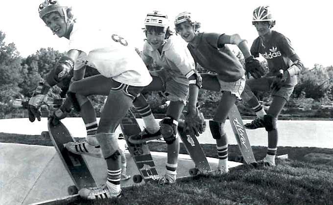 The B & W one is circa '78. Brian Grant, Pat Schutte, Tom Venus and Tim Grant. 8th graders at the time at Van Hoosen Jr. High, Tim was in 9th at Rochester Adams. Noteworthy: Check out the Logan Earth Ski decks me and Brian are running, and the original Alva deck Tim's on. This was when Rochester's "Roach Boyz" were in their prime and dominated the first Endless Bummer pool freestyle contest (Jeff "JJ" Jackson, Kit Shigur, Chris Yandall, Todd Cadieux, Pat Murphy, Randy Kniesley, Steve Sowter, Rob Hamburg). I came on in the second wave of Roach Boyz, with Rob Mahanes and Mike Manich. Arguably, Rochester's Roach Boyz were to the Michigan skate what Dogtown was to the Cali scene for about three summers back then - '76 through '78. Rough, innovative, rowdy, dope smoking/drinking - basically just came in and blew doors in contest, blew minds in the pools - both backyard and parks.