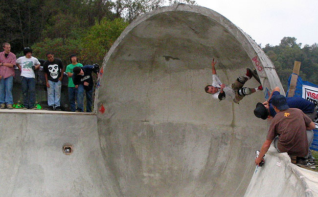 Tuckman gets it going with pasting a sticker at about 20" from the top. That got the crowd and the skaters all hyped. Next up was Dale Busta. He gets his flow on and slaps one a bit farther up the pipe. He was now in first and Dave was bumped to second. A couple of more skaters gave it a shot but it was Grant who showed whats up. Grant got a sticker about 7" from the top. On his second run he pasted one just under his first one. He was King of the Full Pipe.