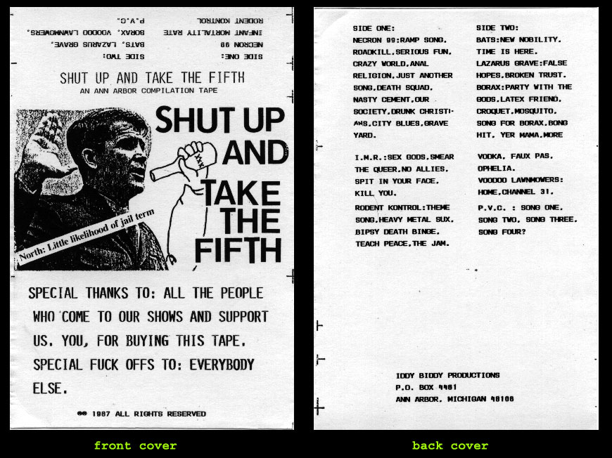 "SHUT UP AND TAKE THE FIFTH" is a compliation of Ann Arbor hardcore/punk bands. This "comp" was put together by Jerry Bush (JB) and originally released in 1987. Feel FREE to download the tracks and play at a LOUD VOLUME!